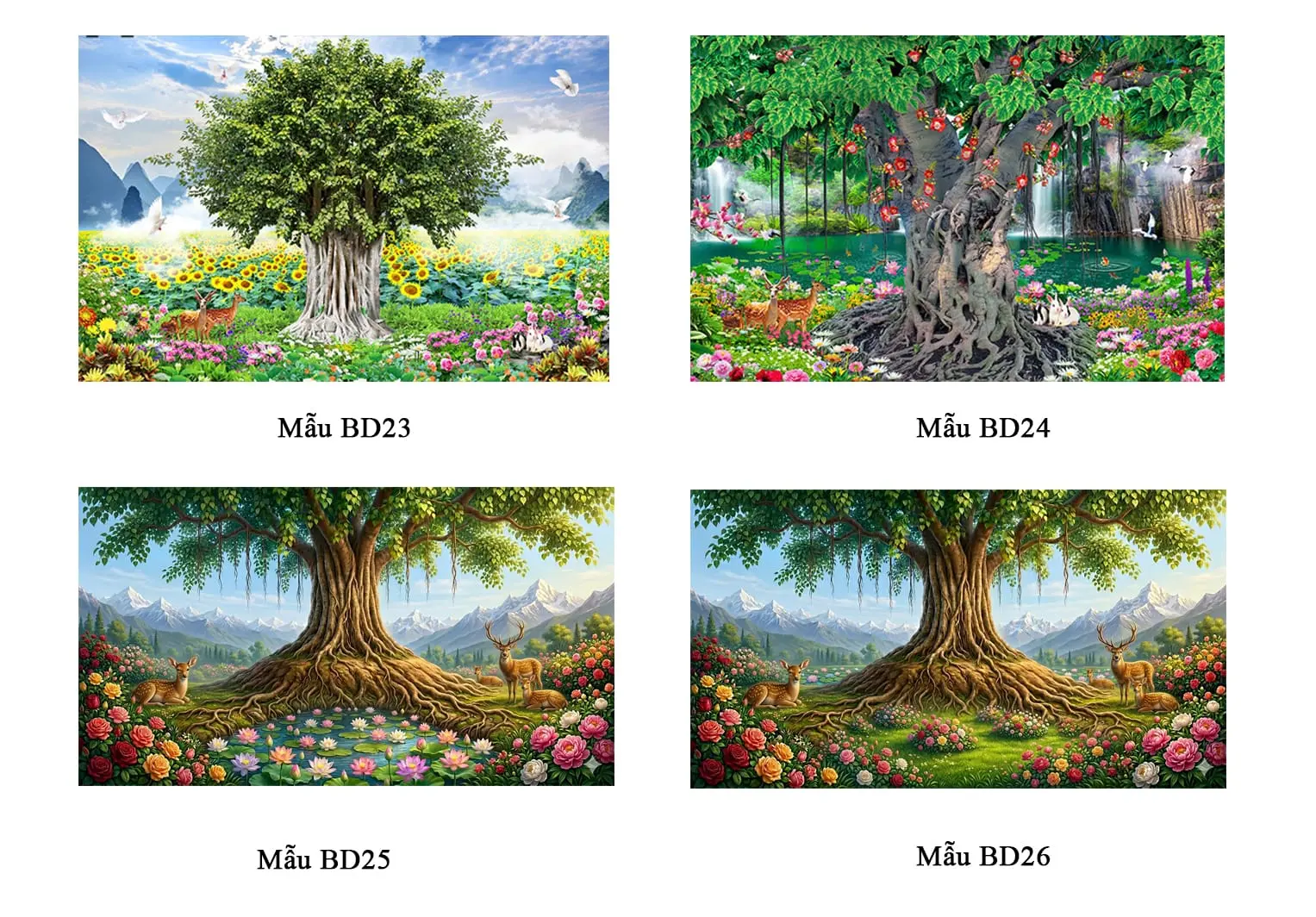 - Toàn cảnh bức tranh mô phỏng hình ảnh cây Bồ Đề làm chủ đạo. Kết hợp với chiếc cầu gỗ trang nhã, gợi vẻ bình yên. Đồng thời, hình ảnh những chú chim trắng, đôi nai đang thong dong gặm cỏ một lần nữa tạo nên điểm nhấn.